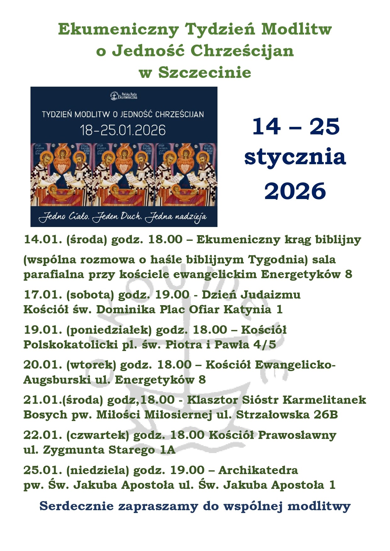 W środę, 14 stycznia 2026 r., rozpoczniemy w naszej Archidiecezji Tydzień Modlitw o Jedność Chrześcijan, przeżywany pod hasłem: „Jedno Ciało, Jeden Duch, Jedna nadzieja” (por. Ef 4,4). Program tygodnia umieszczony został na odrębnym plakacie: